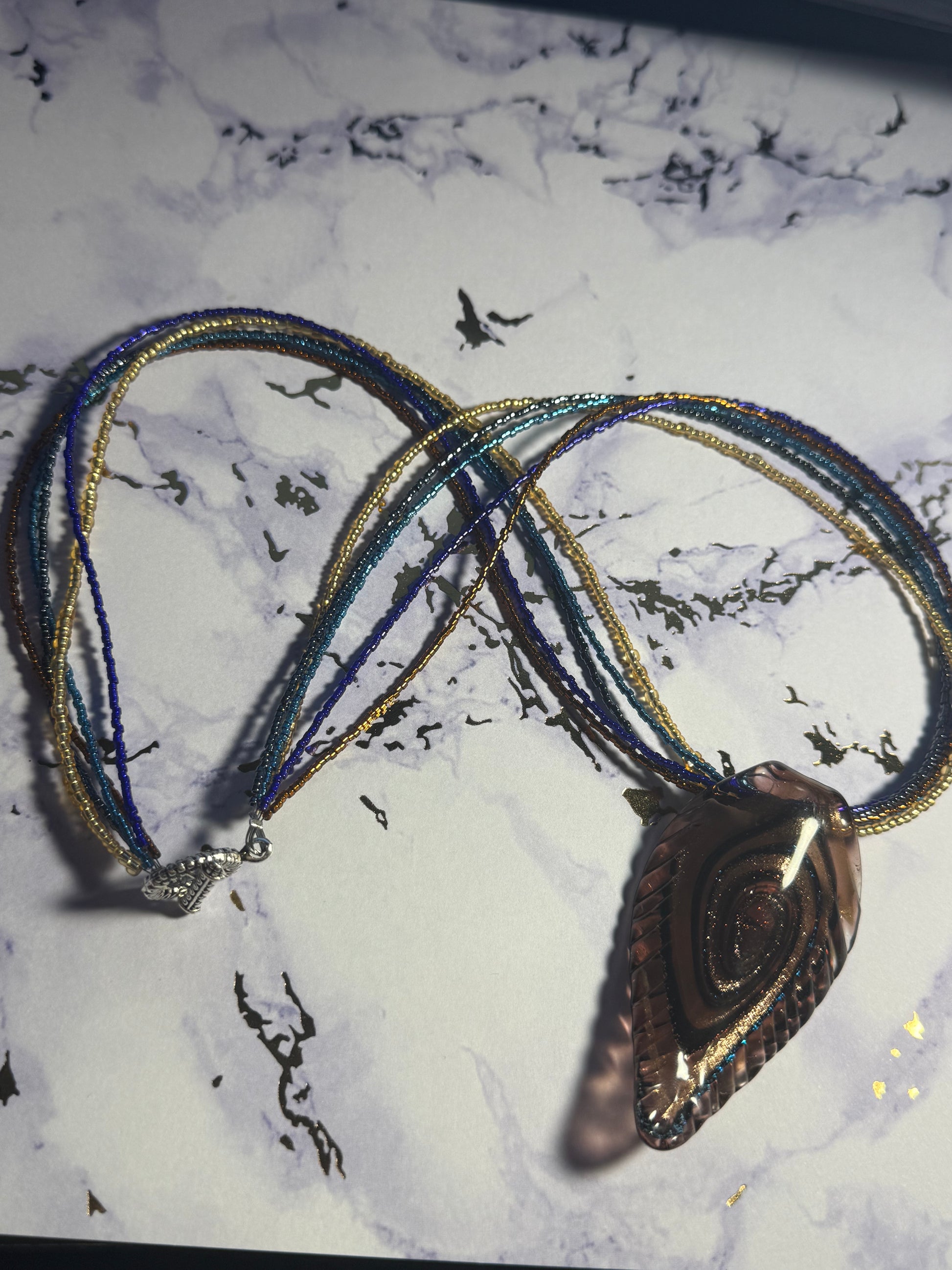 Multi-strand necklace made with flexible beading wire and nickel free hardware in a classic style to compliment the glass pendant.